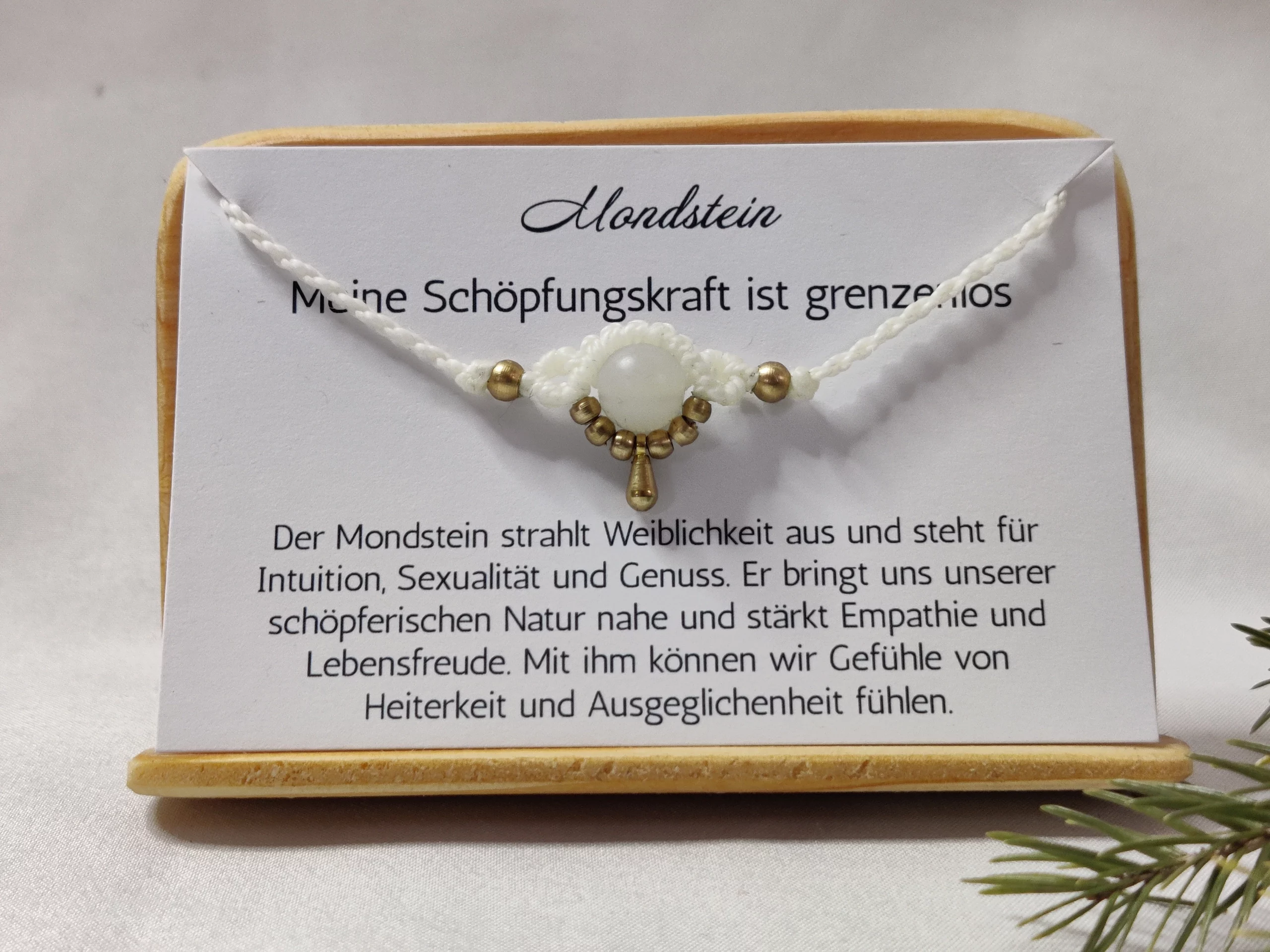 Material: Mondstein, Linhasita Makramee-Garn, Messingperlen | Maße: 8 mm (Perle) / 55 x 85 mm (Karte)