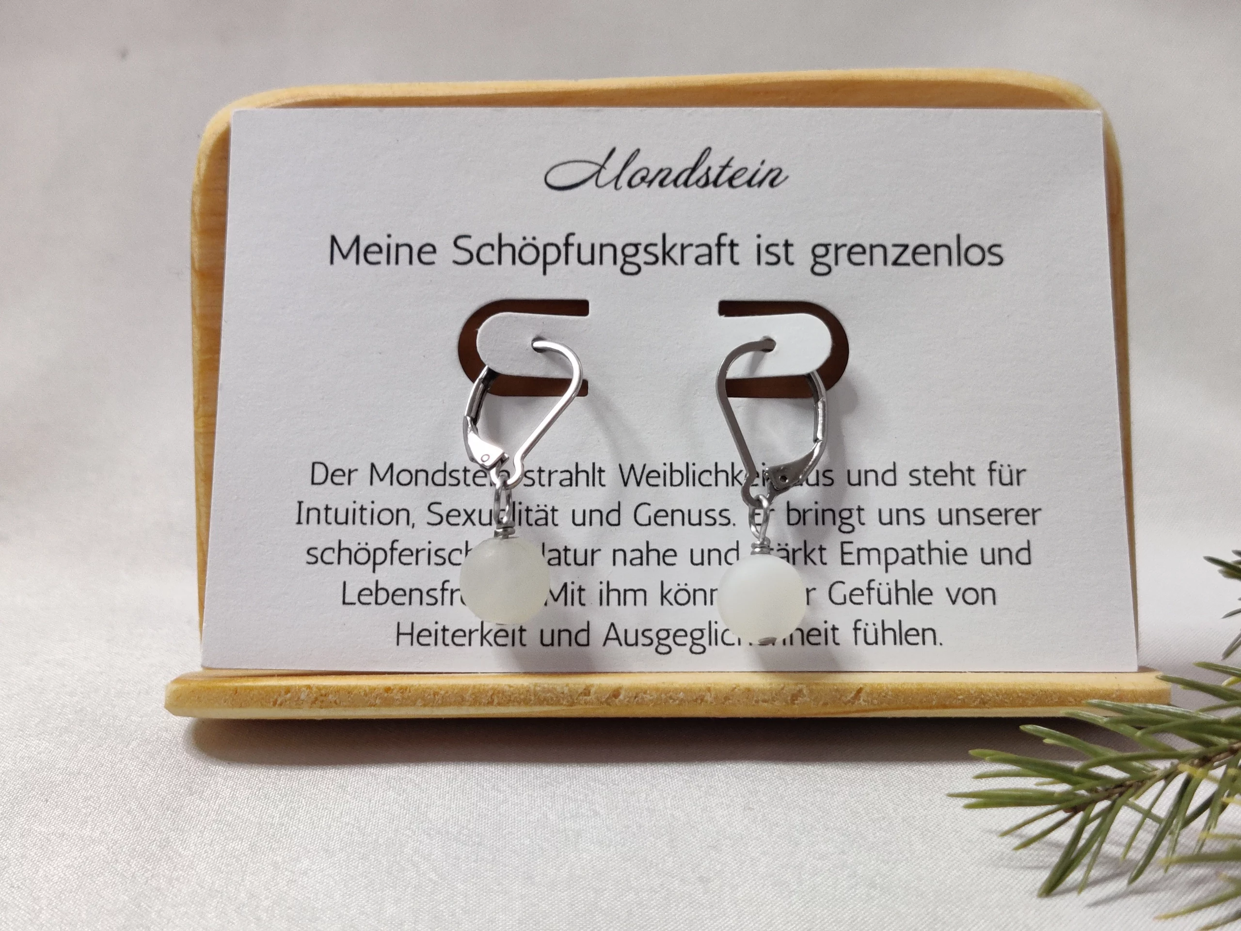 Material: Mondstein, Edelstahl | Maße: 8 mm (Perle) / 55 x 85 mm (Karte)