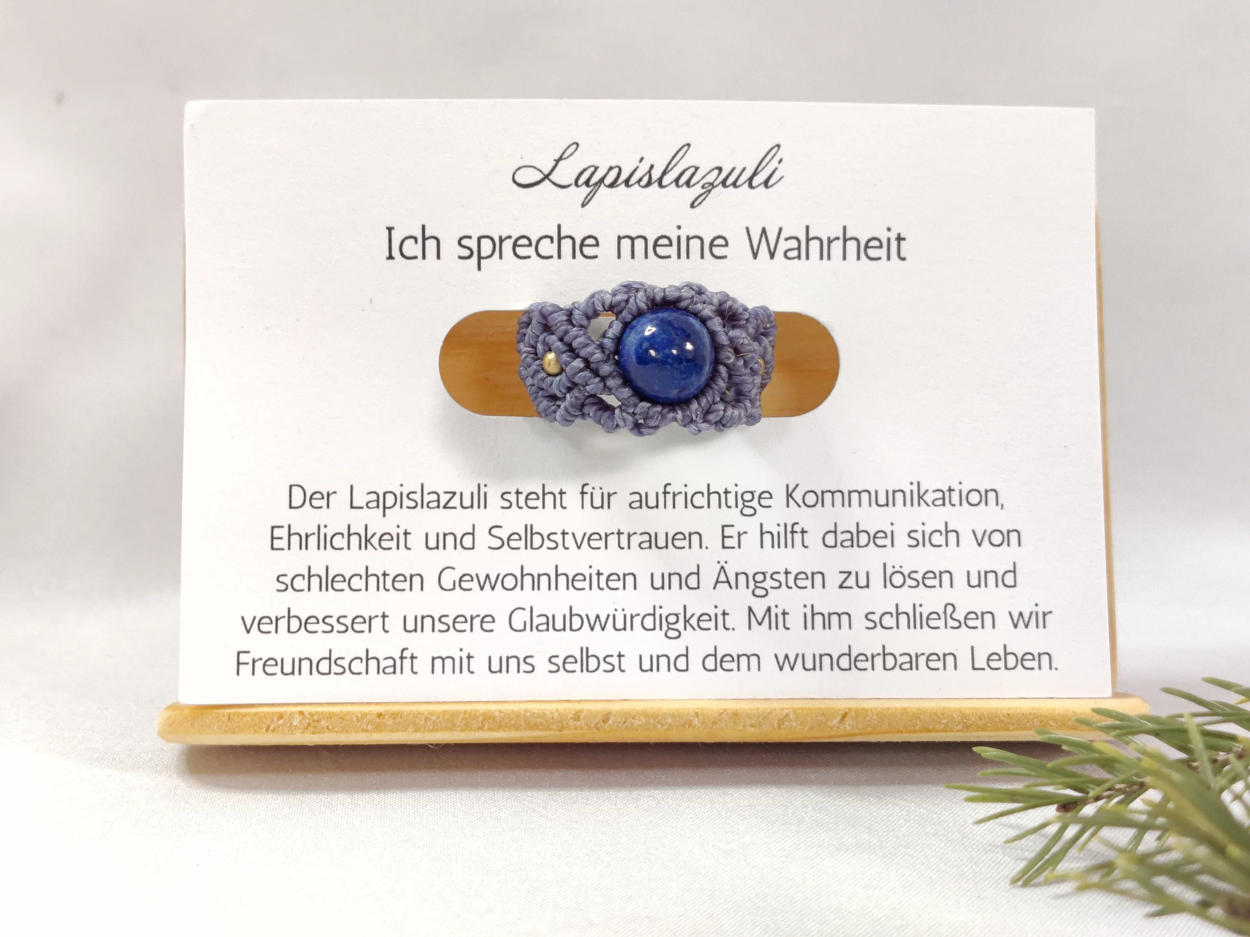 Material: Lapislazuli, Linhasita Makramee-Garn, Messingperlen | Maße: 8 mm (Perle) / 55 x 85 mm (Karte)