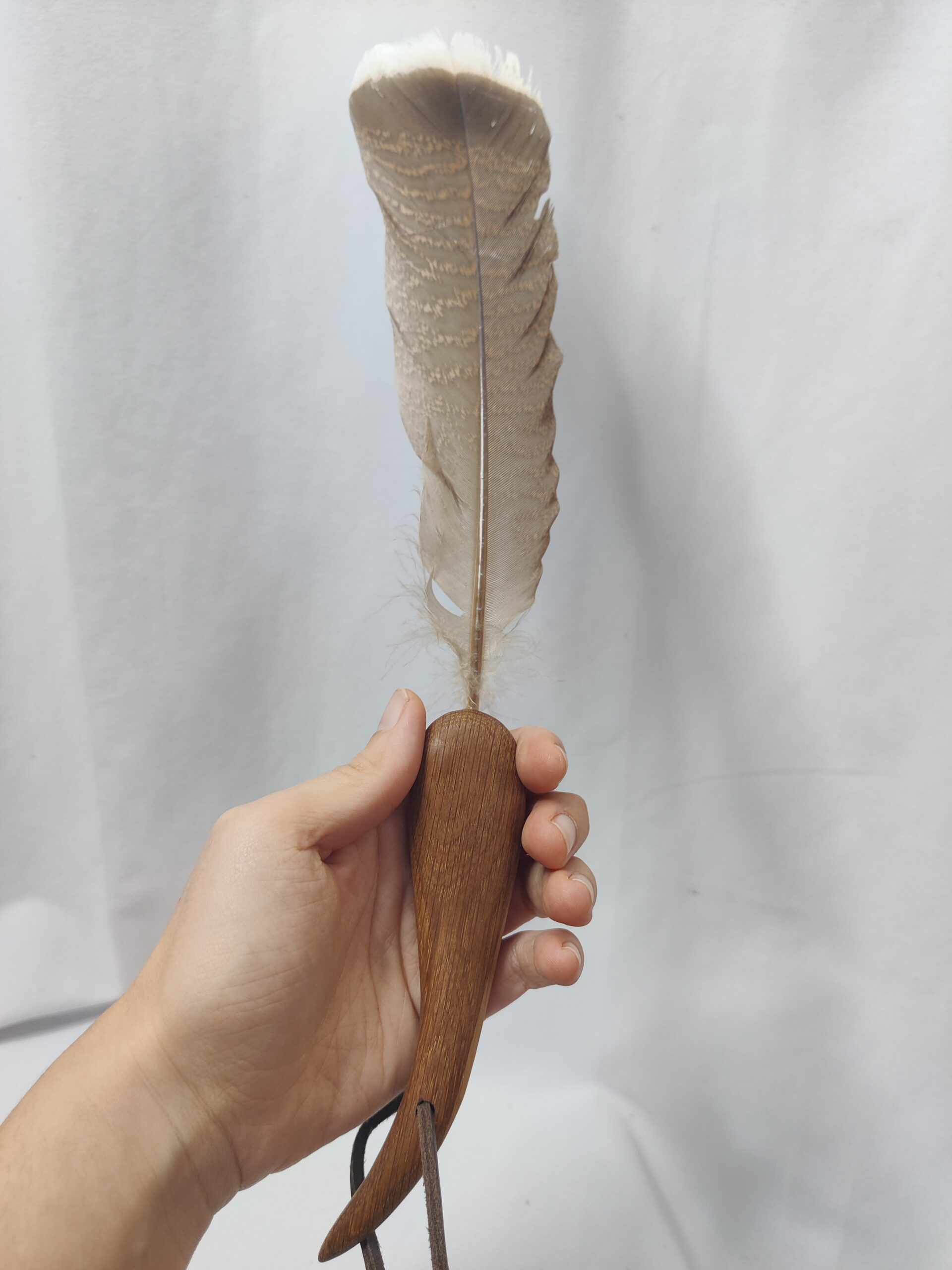 Schamanischer Fächer mit Truthahnfeder und Eichengriff – ein echtes Unikat, in sorgfältiger Handarbeit gefertigt.