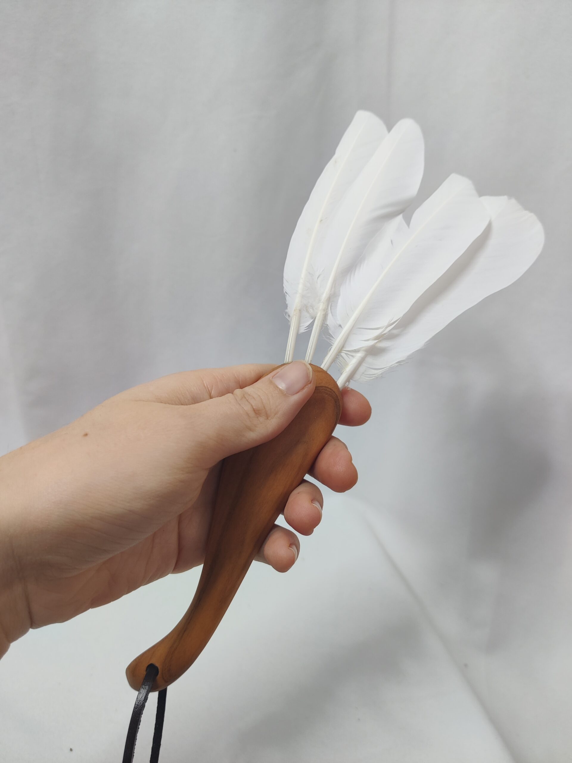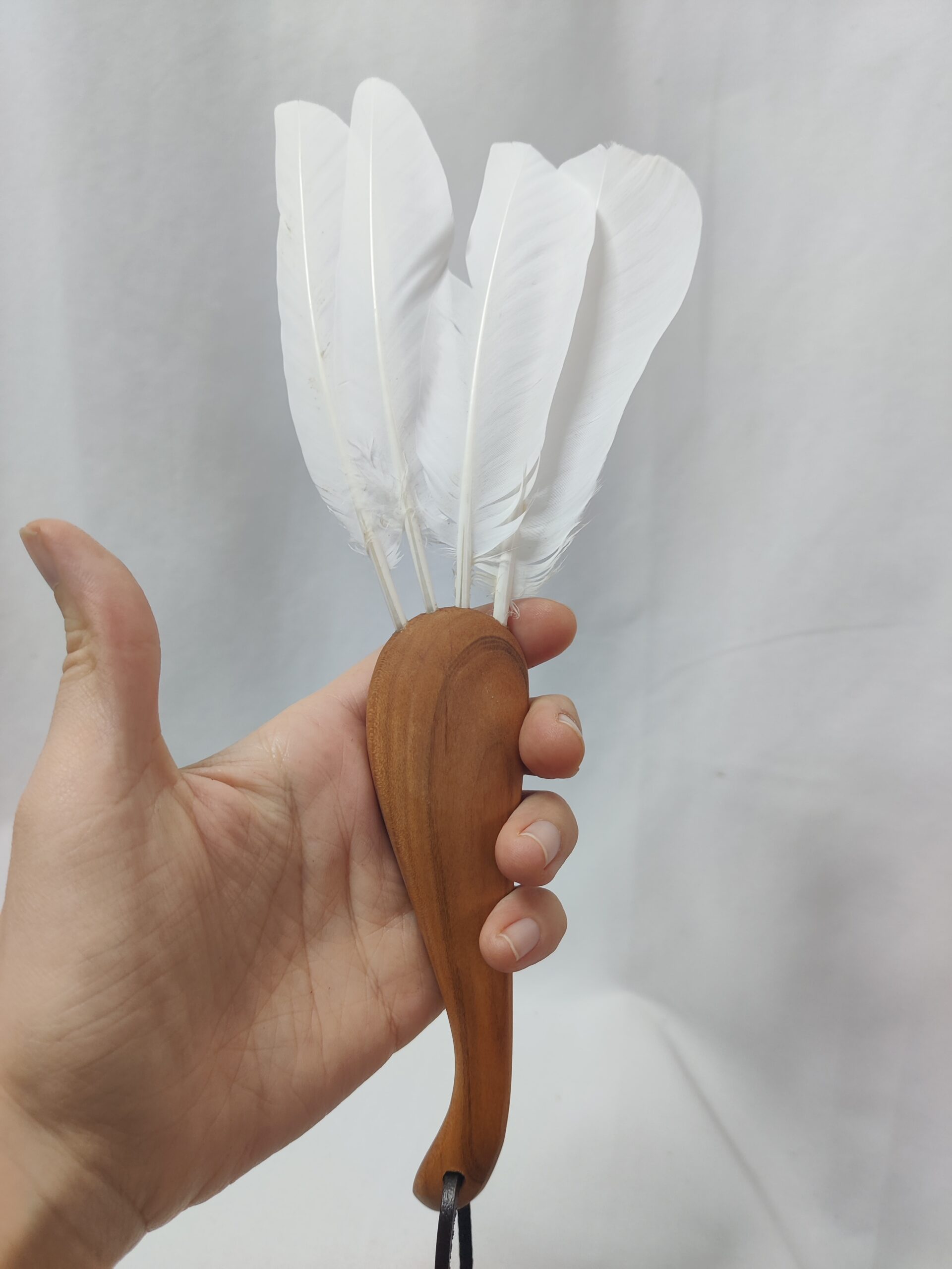 Ideal für Räucherungen, energetische Reinigung und schamanische Rituale. Der ergonomische Holzgriff liegt sicher in der Hand; die Federn verteilen den Rauch sanft und kontrolliert.