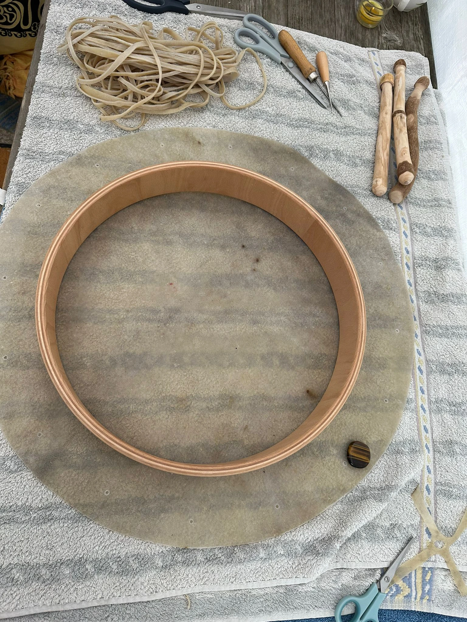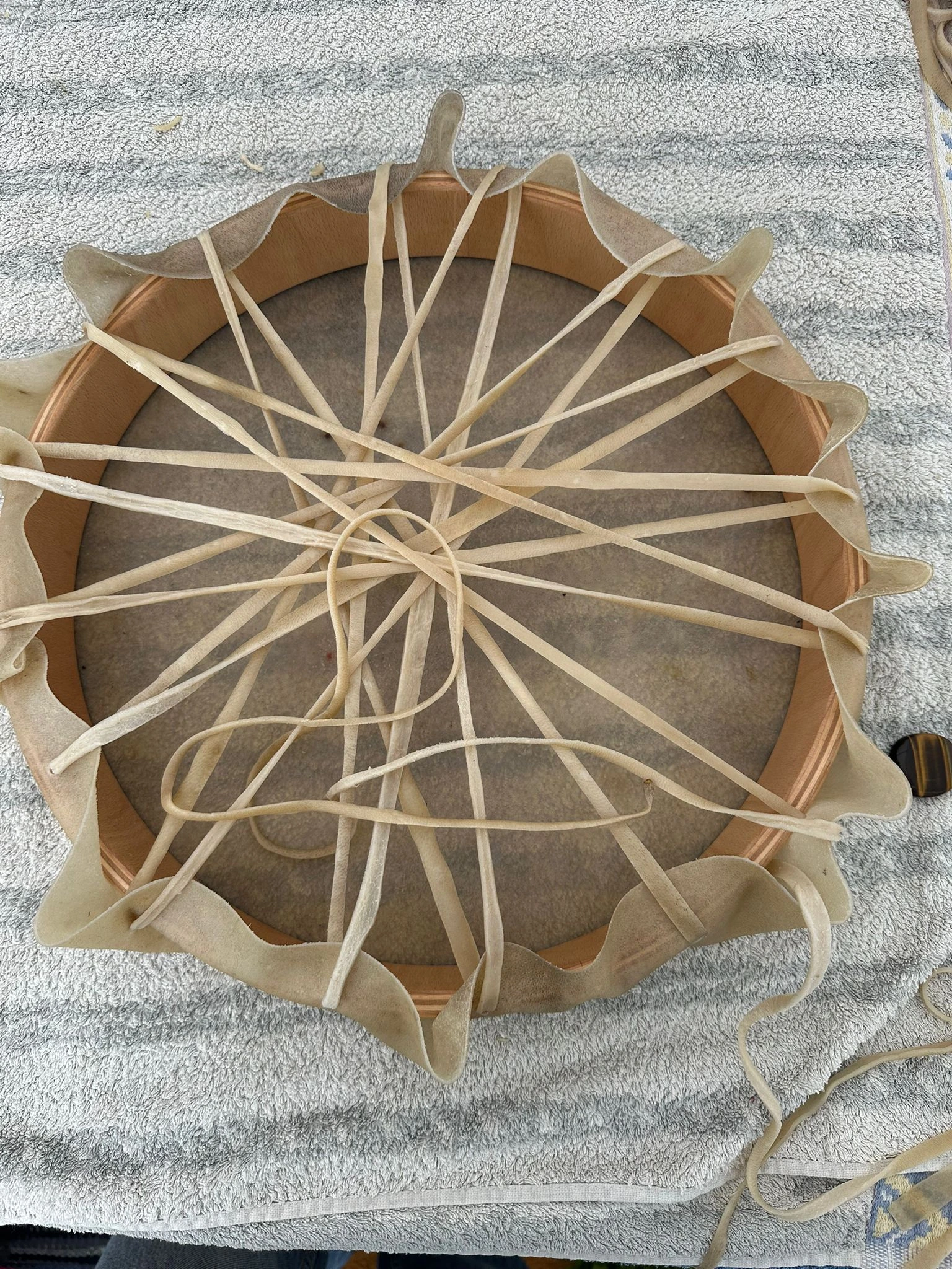 Die Trommel wird aus Tierhaut gefertigt. Wir gehen mit Respekt und Bewusstsein für die Herkunft des Materials in diesen Prozess.